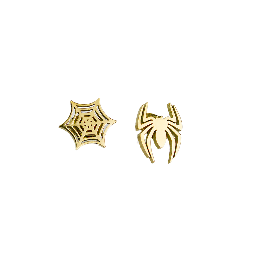 Une paire de puces d'oreilles araignée et toile d'araignée en acier inoxydable doré.
