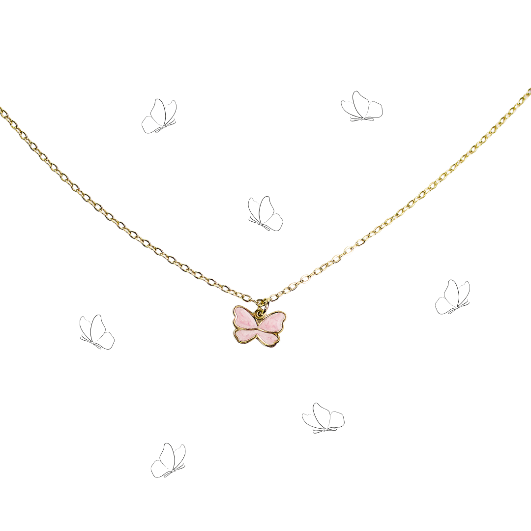 Collier enfant chaine et pendentif délicat représentant un papillon avec des ailes émaillées en rose pastel. Son forme raffinée évoque légèreté et élégance, parfait pour un style poétique, le tout en acier inoxydable.