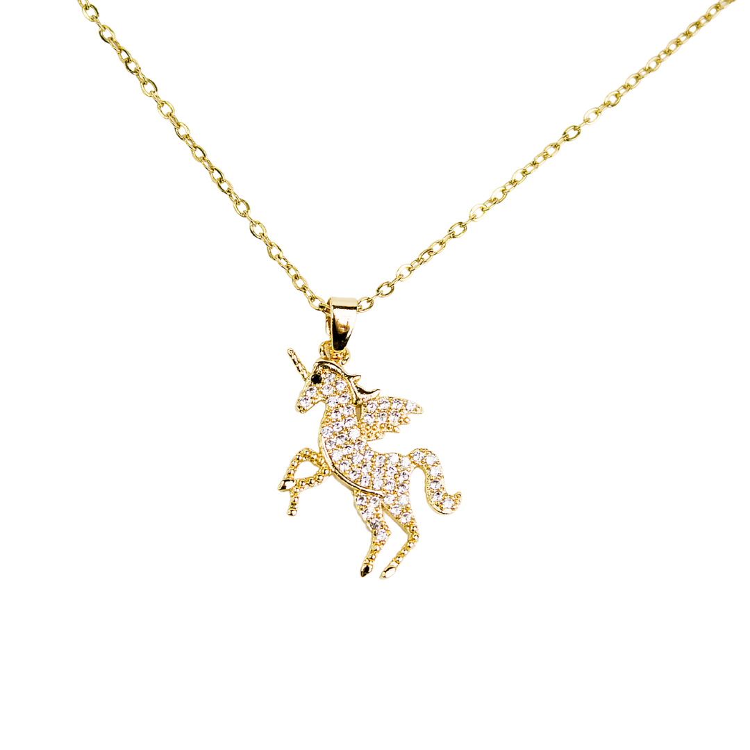 Collier chaine et pendentif représentant une licorne en strass, le tout en acier inoxydable doré.